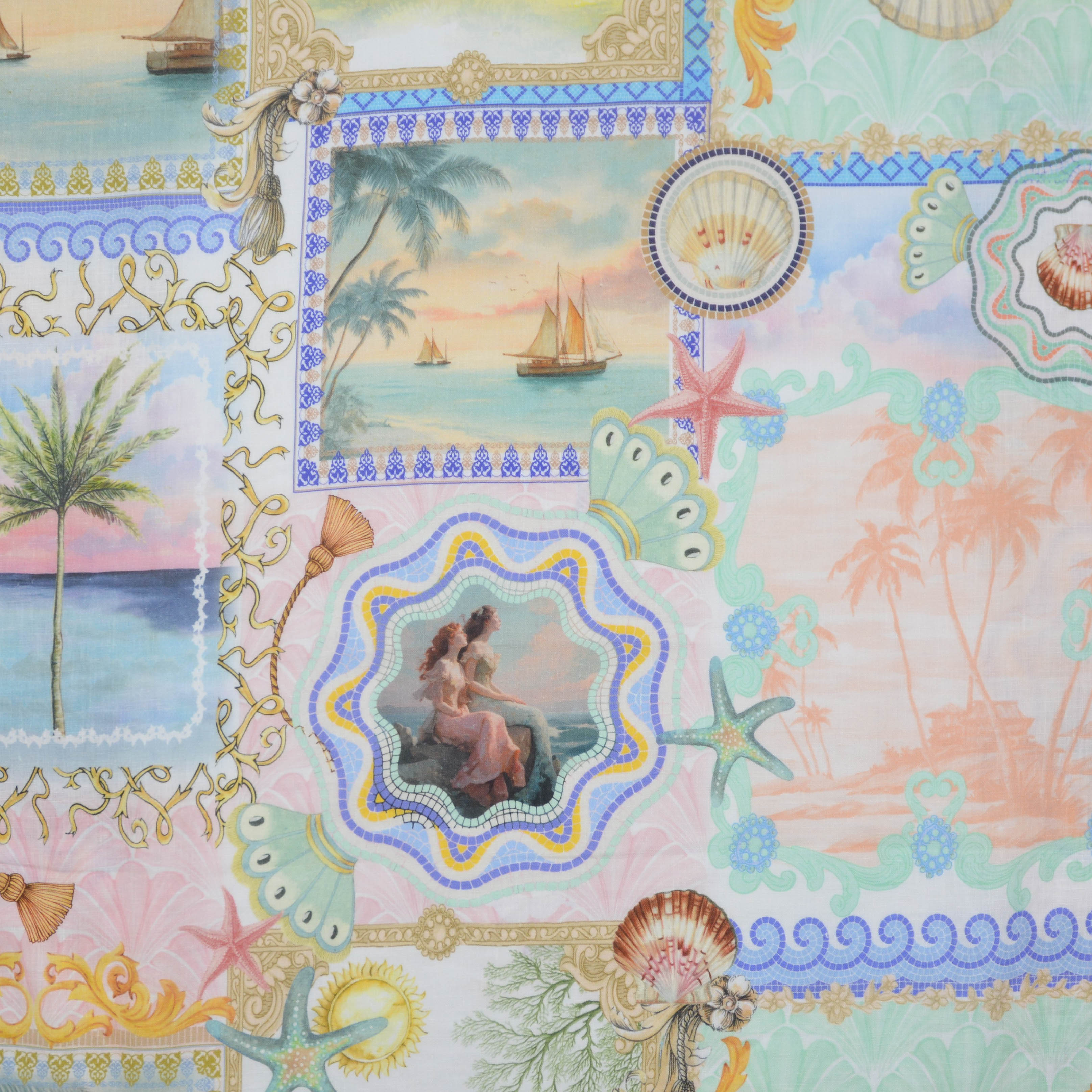 Multicoloured, pastel images of shells, beaches and mermaids, printed on a medium weight linen.