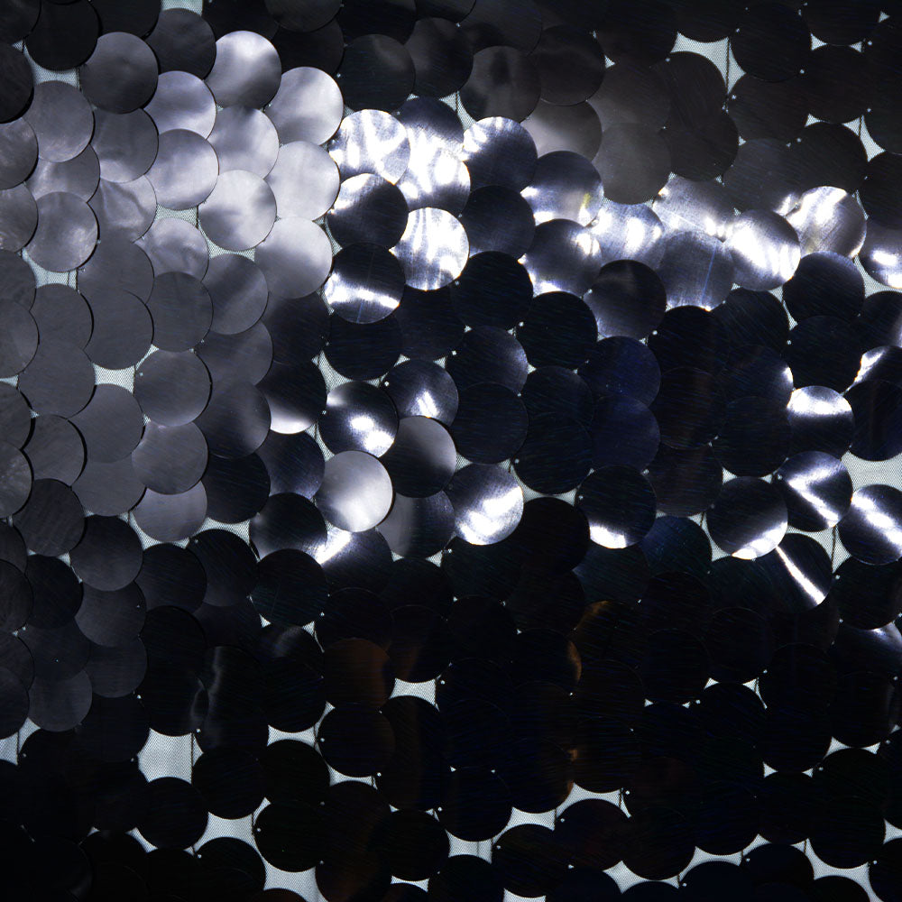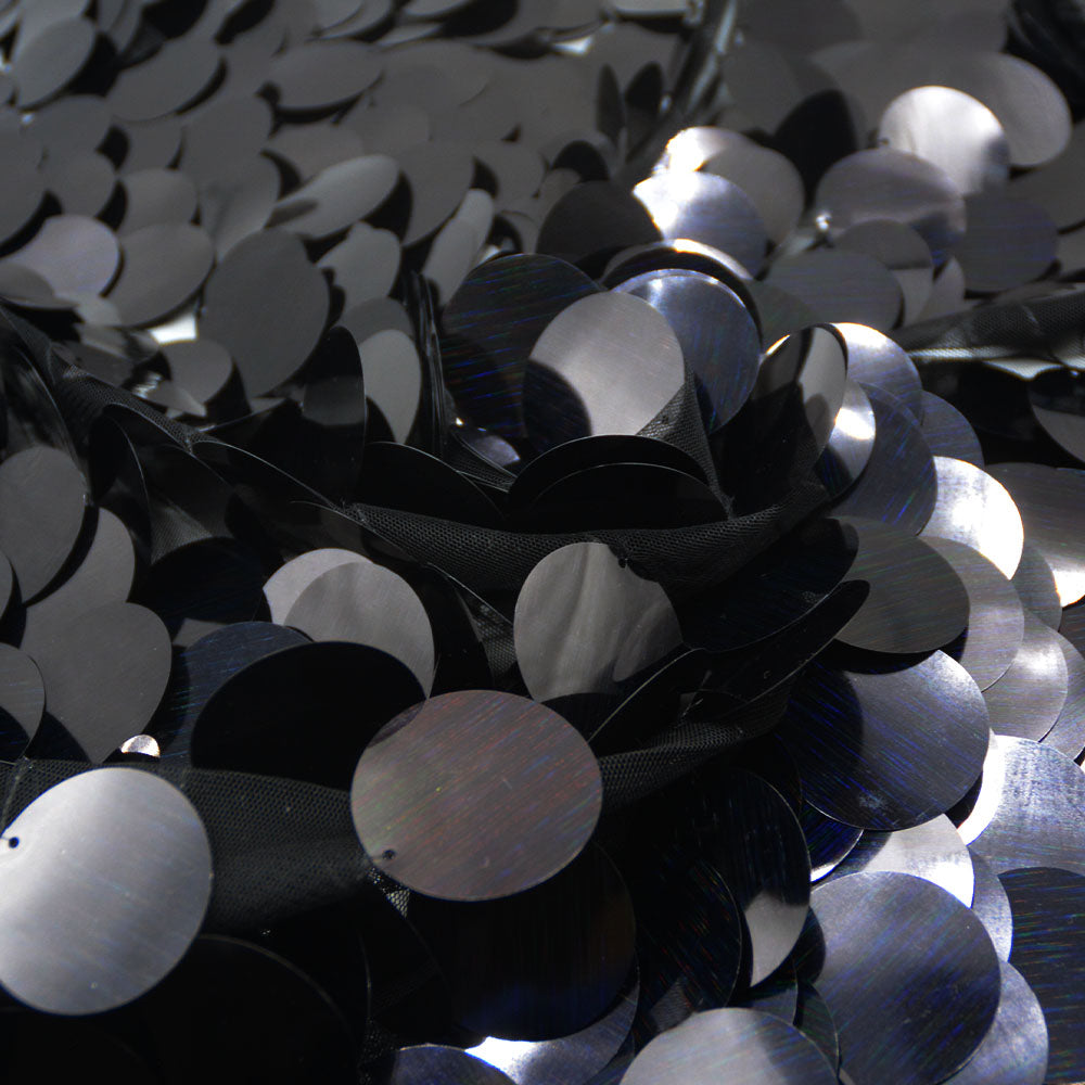 Black mesh embroidered with spectacular large black, round sequins. Sequins approx 4cm wide with slight holographic coloured streaks, direction running from left to right.