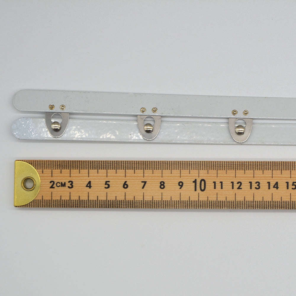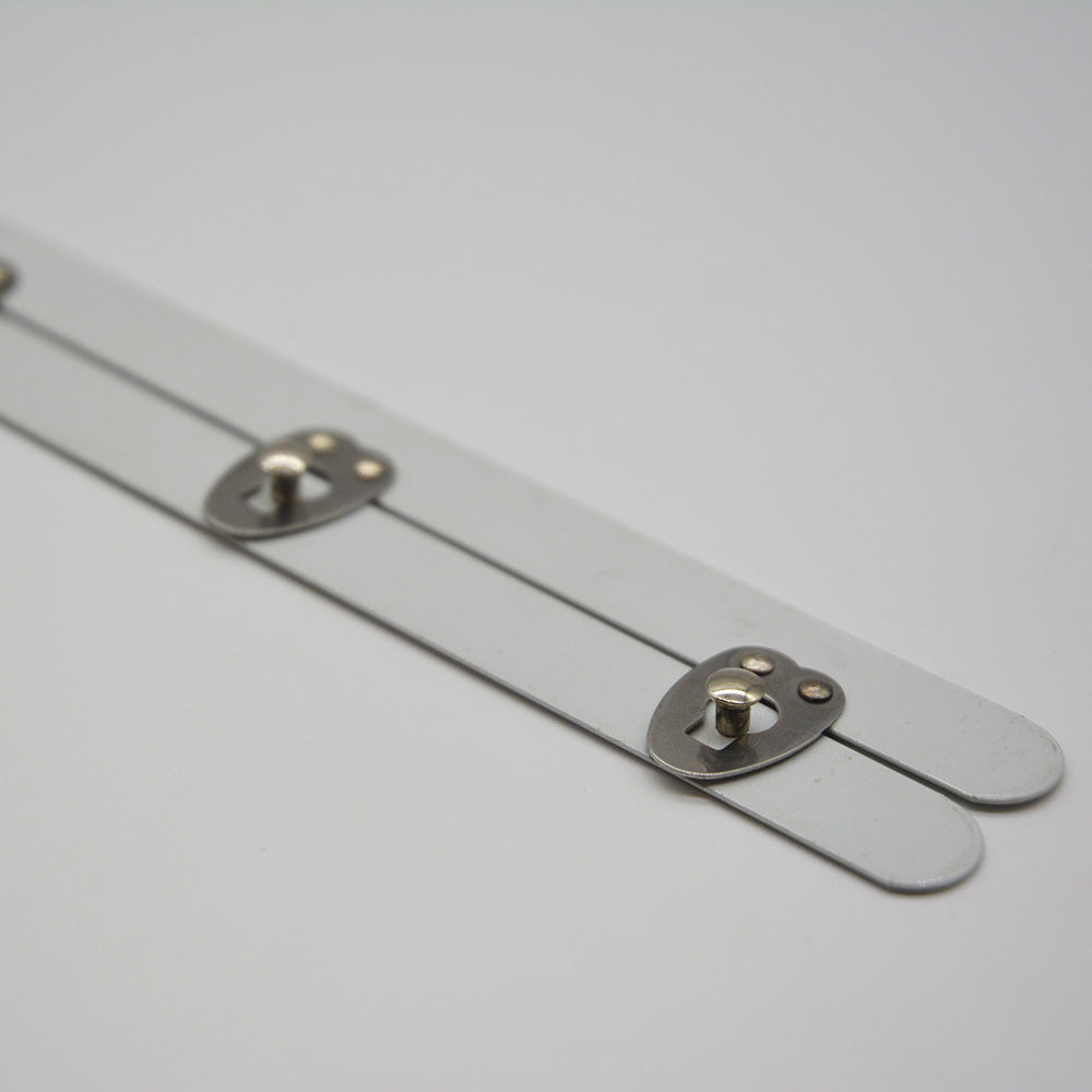 A 2-part corset busk with 6 hook and eyes spaced every 4.5cm along the busk, and positioned 2.25cm from each end.