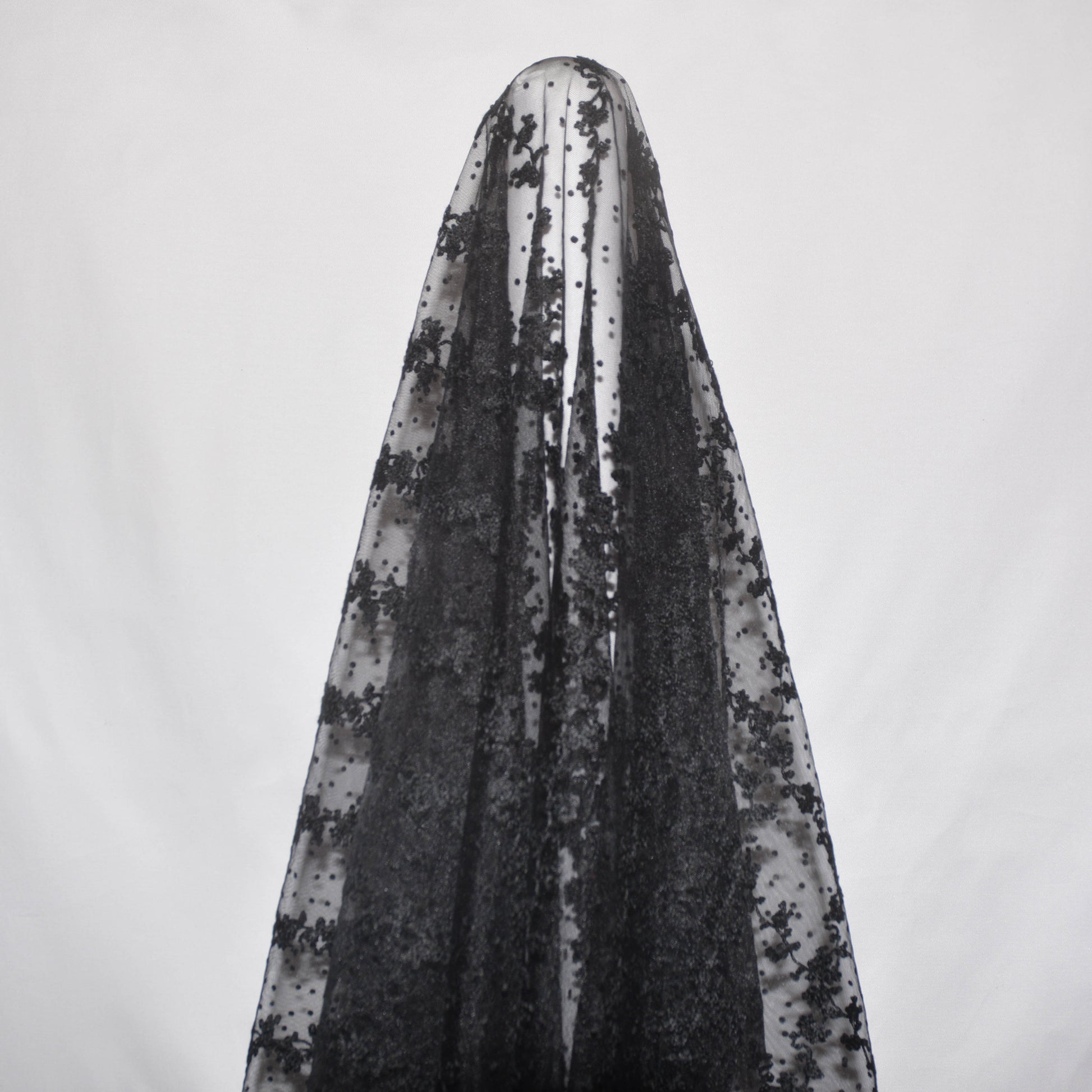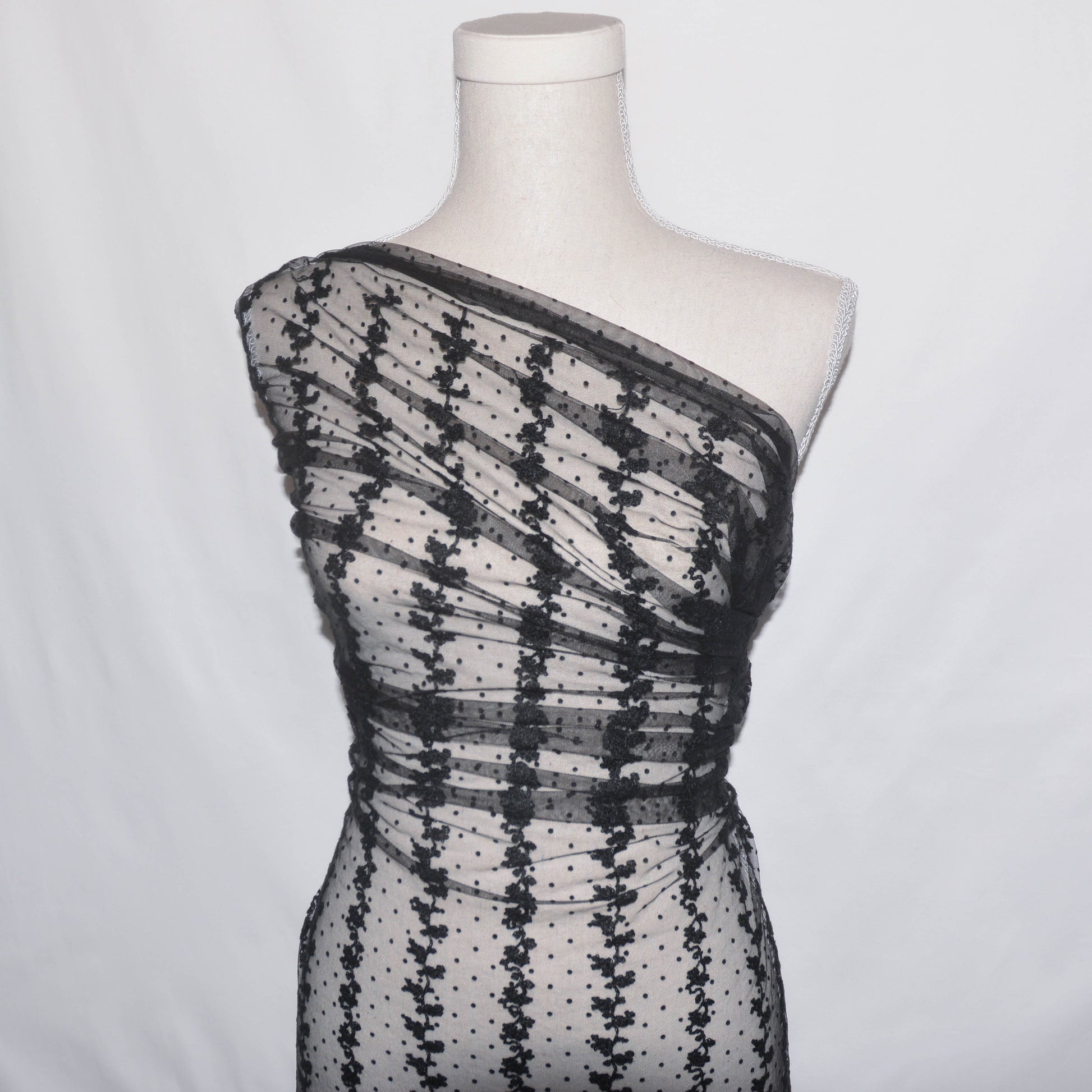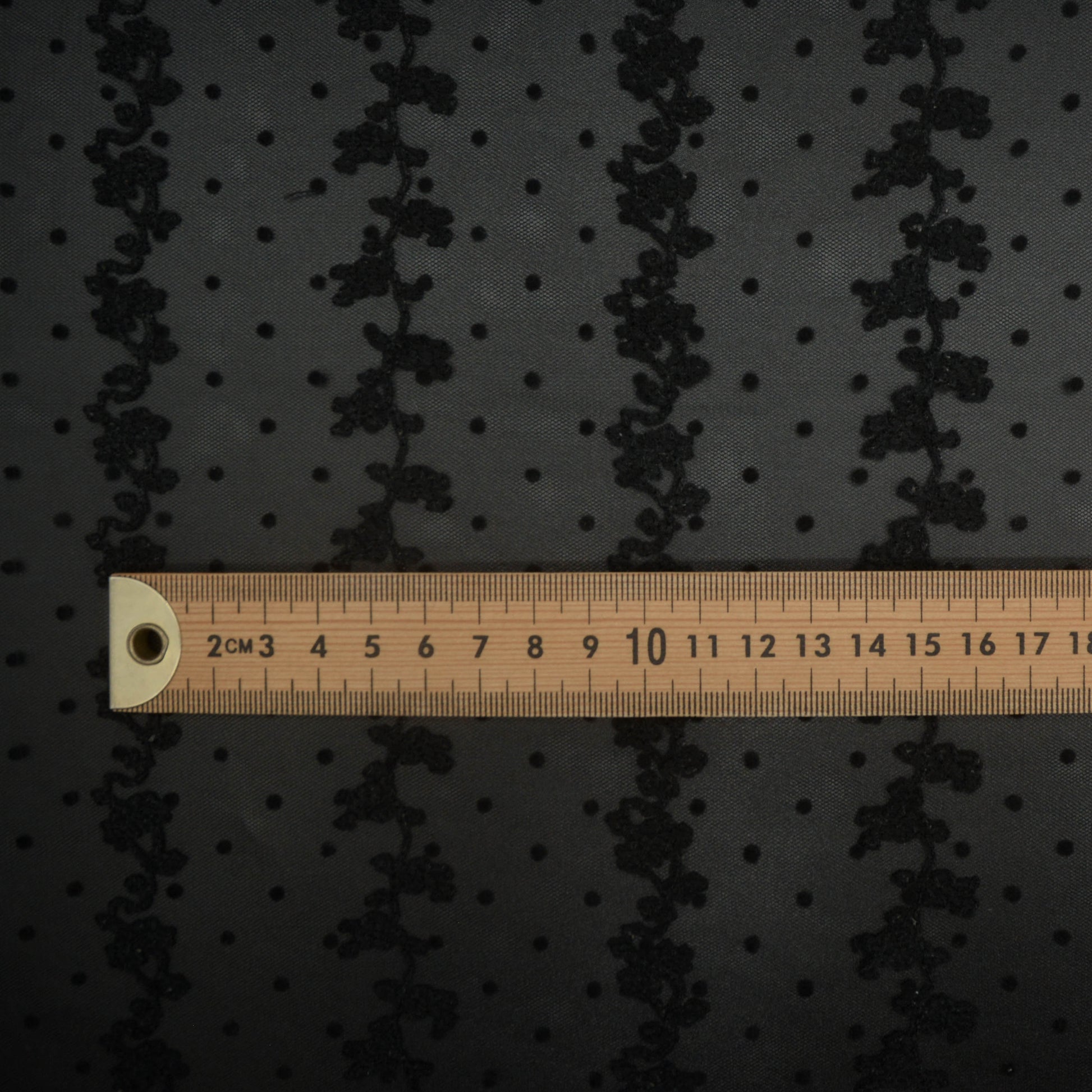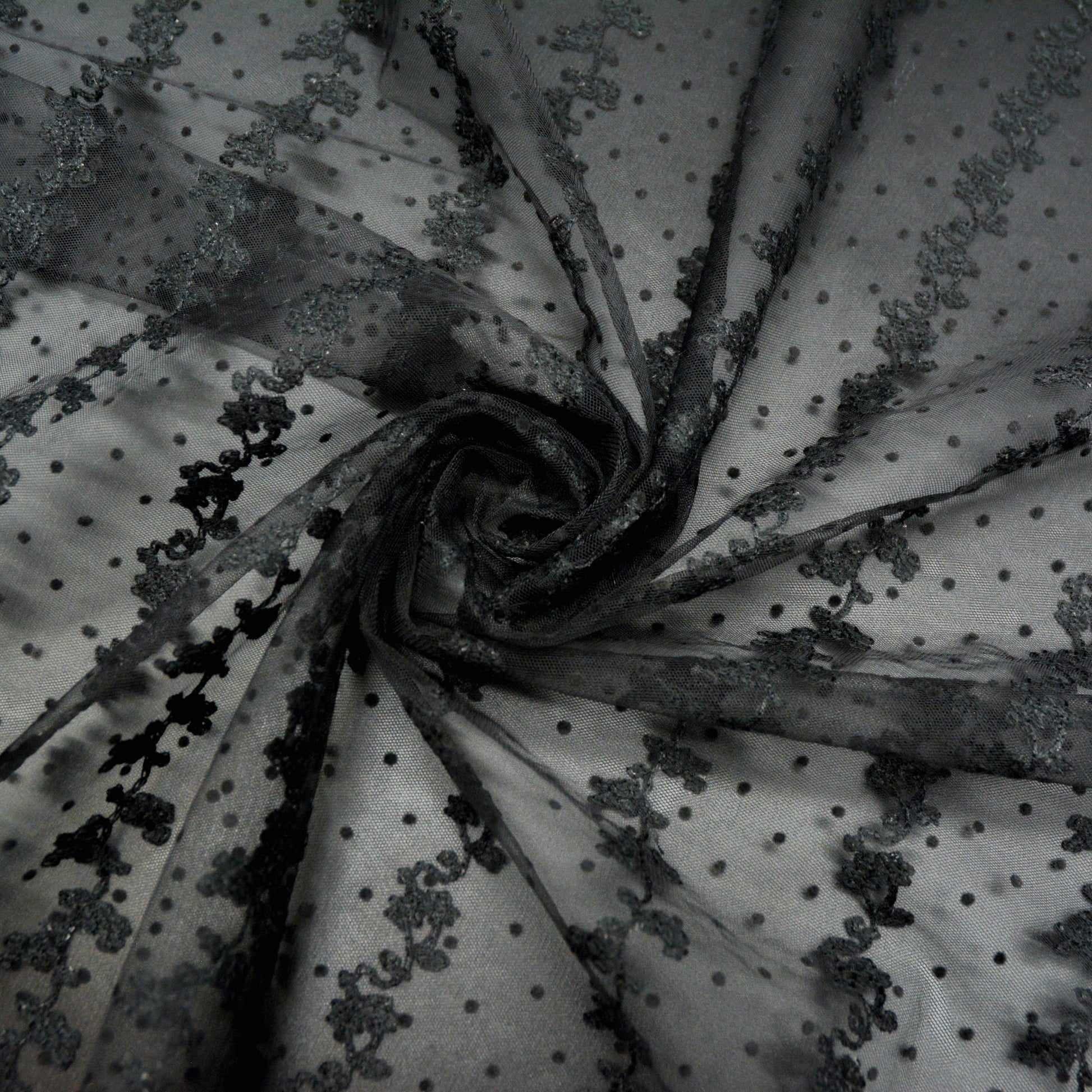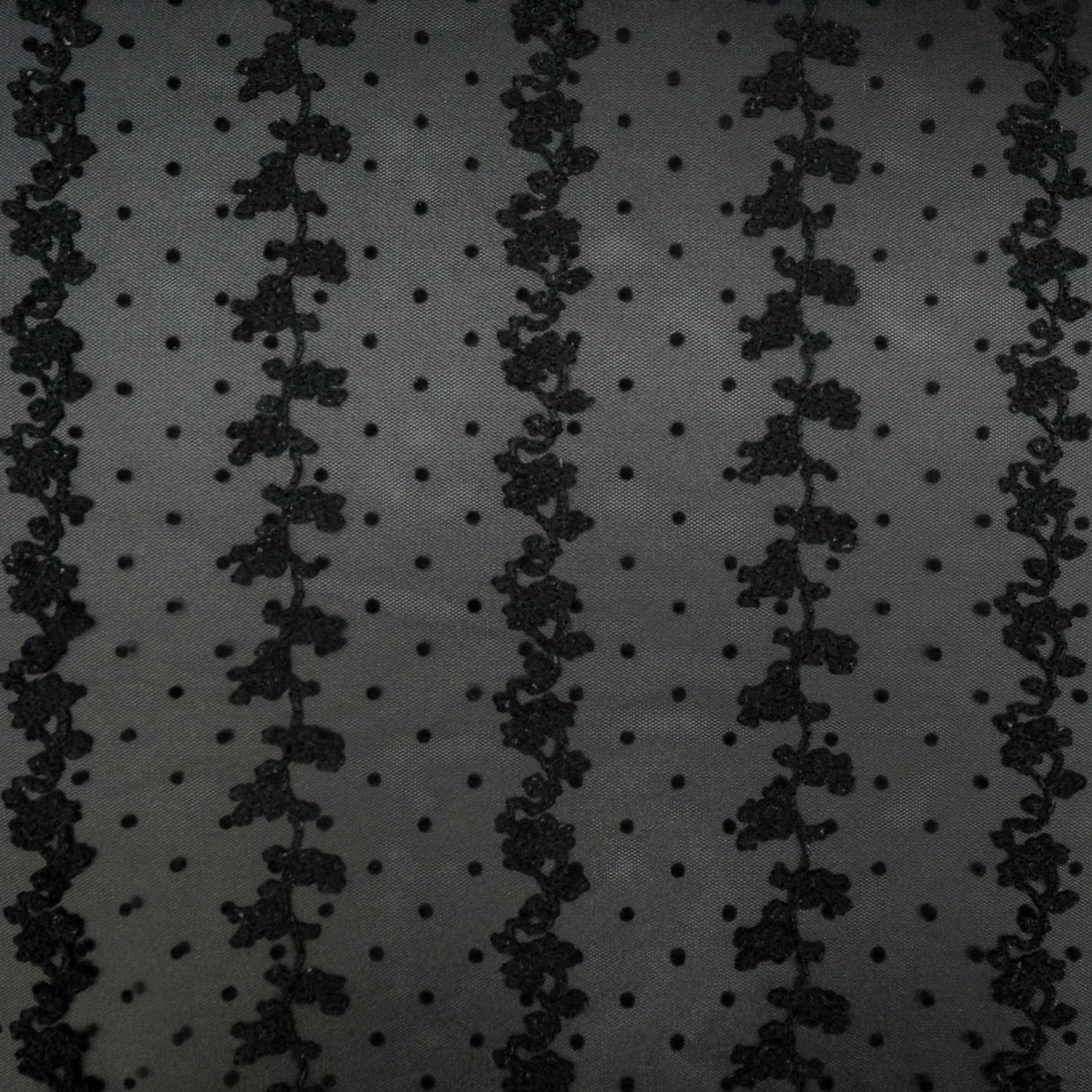 Delicate grapevine embroidery running along the fabric width, with small felt spots on a fine tulle.