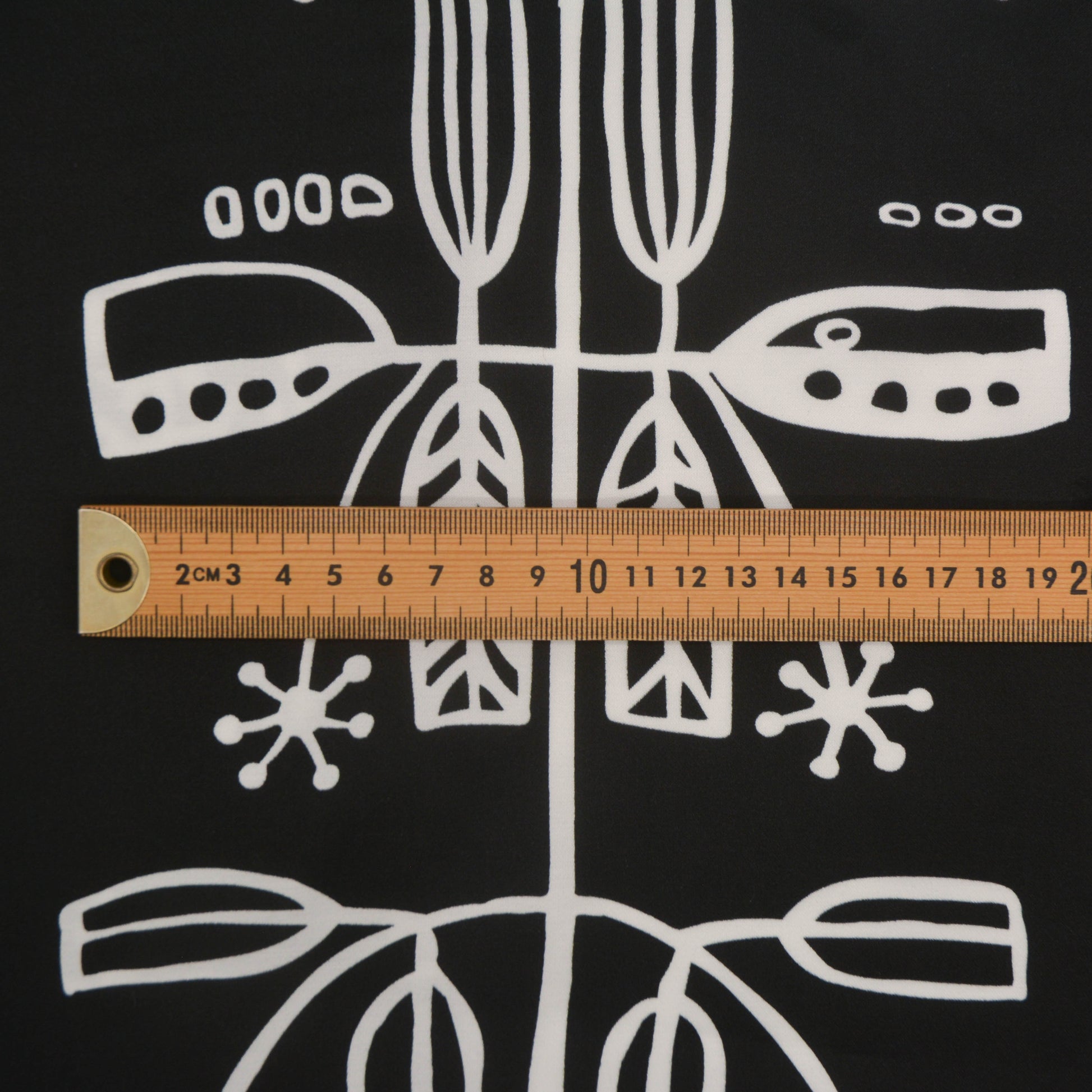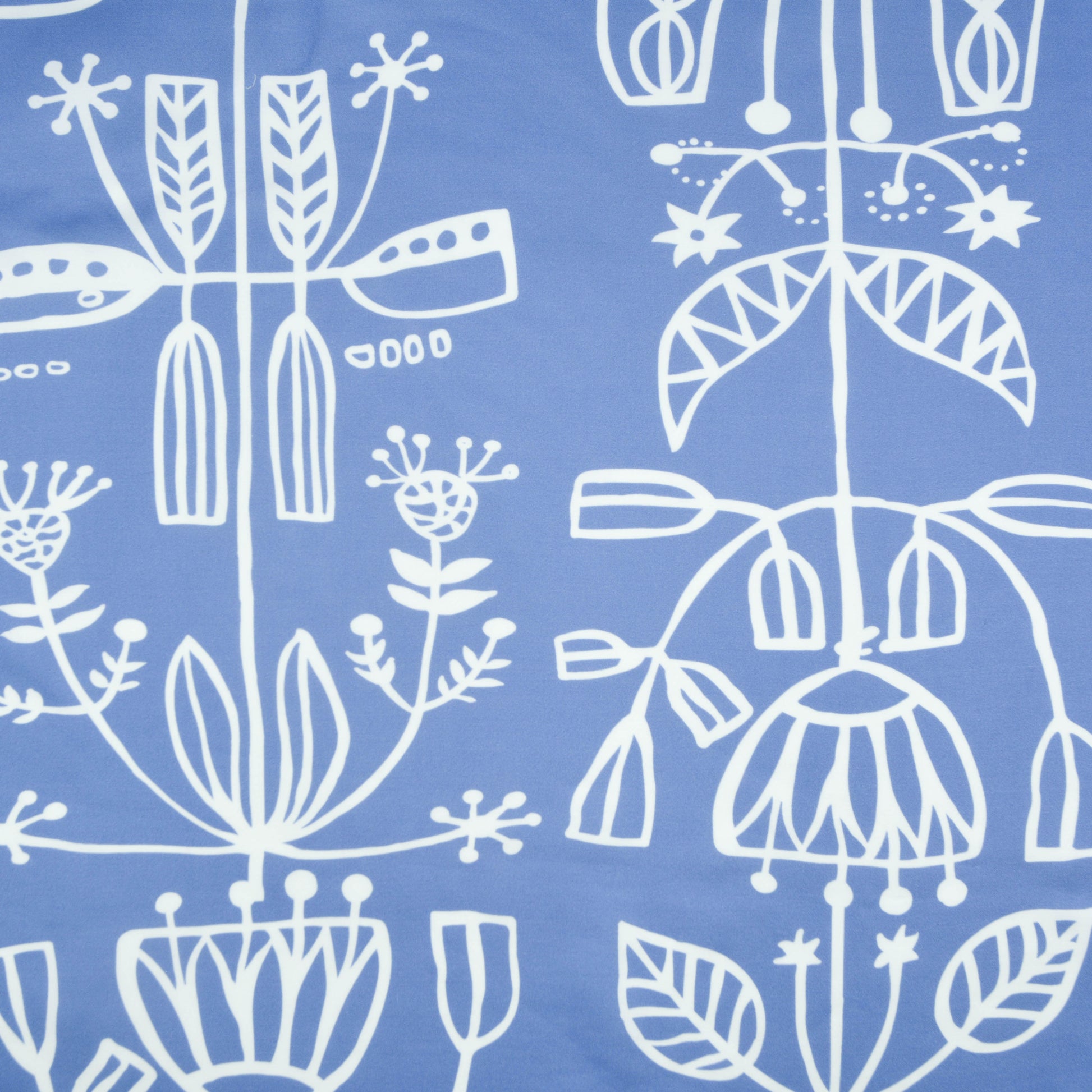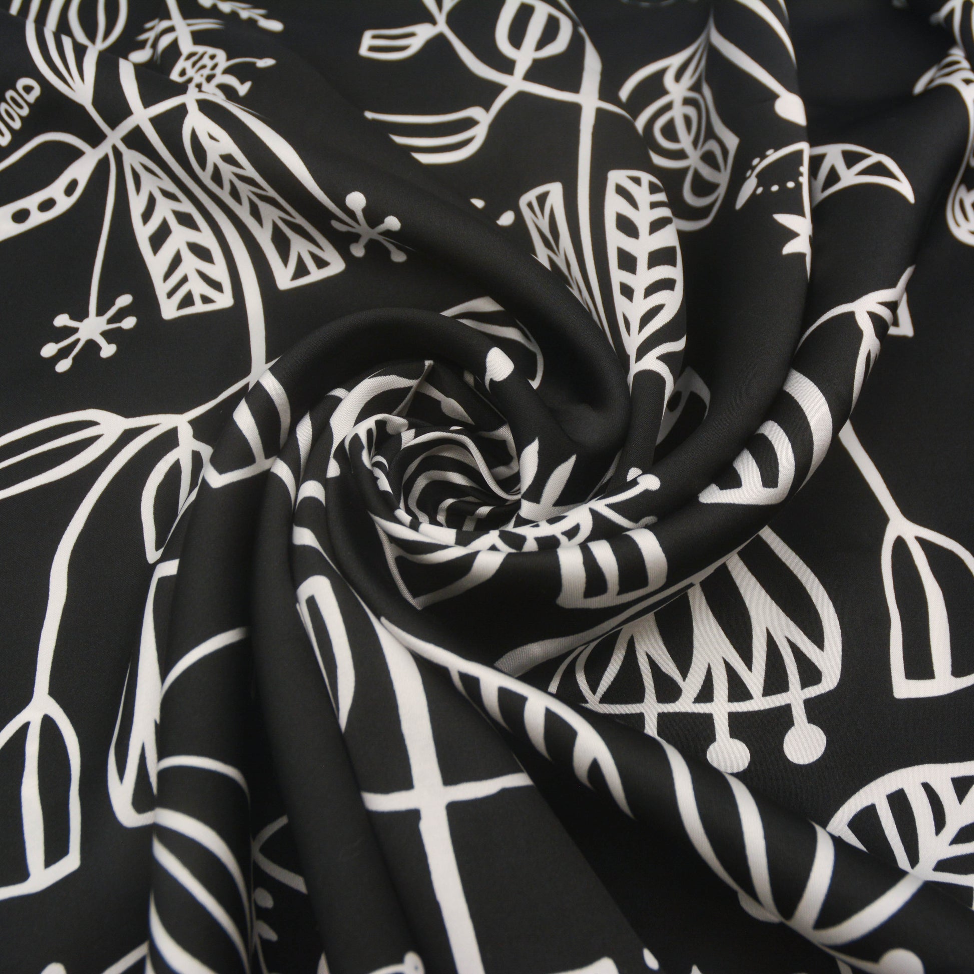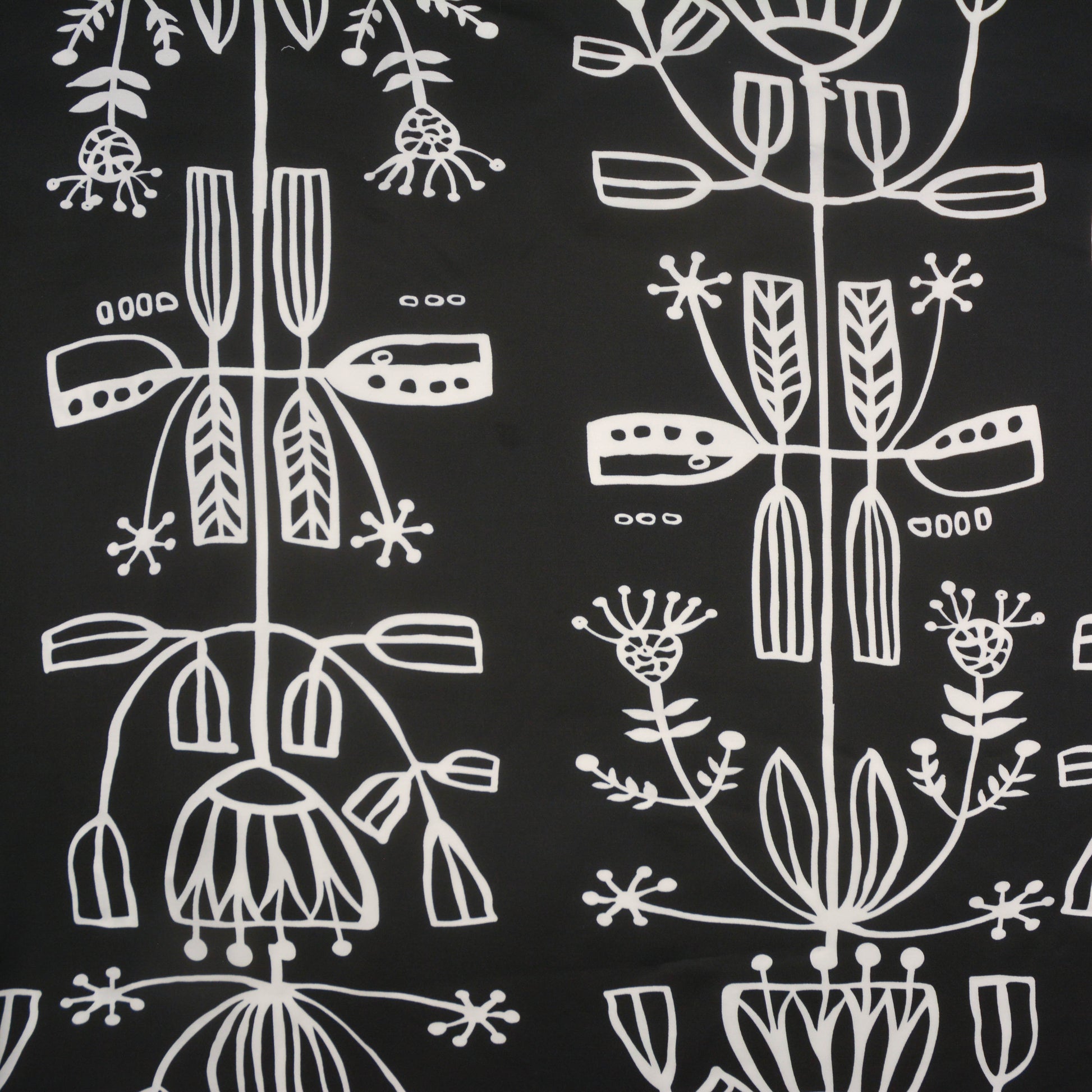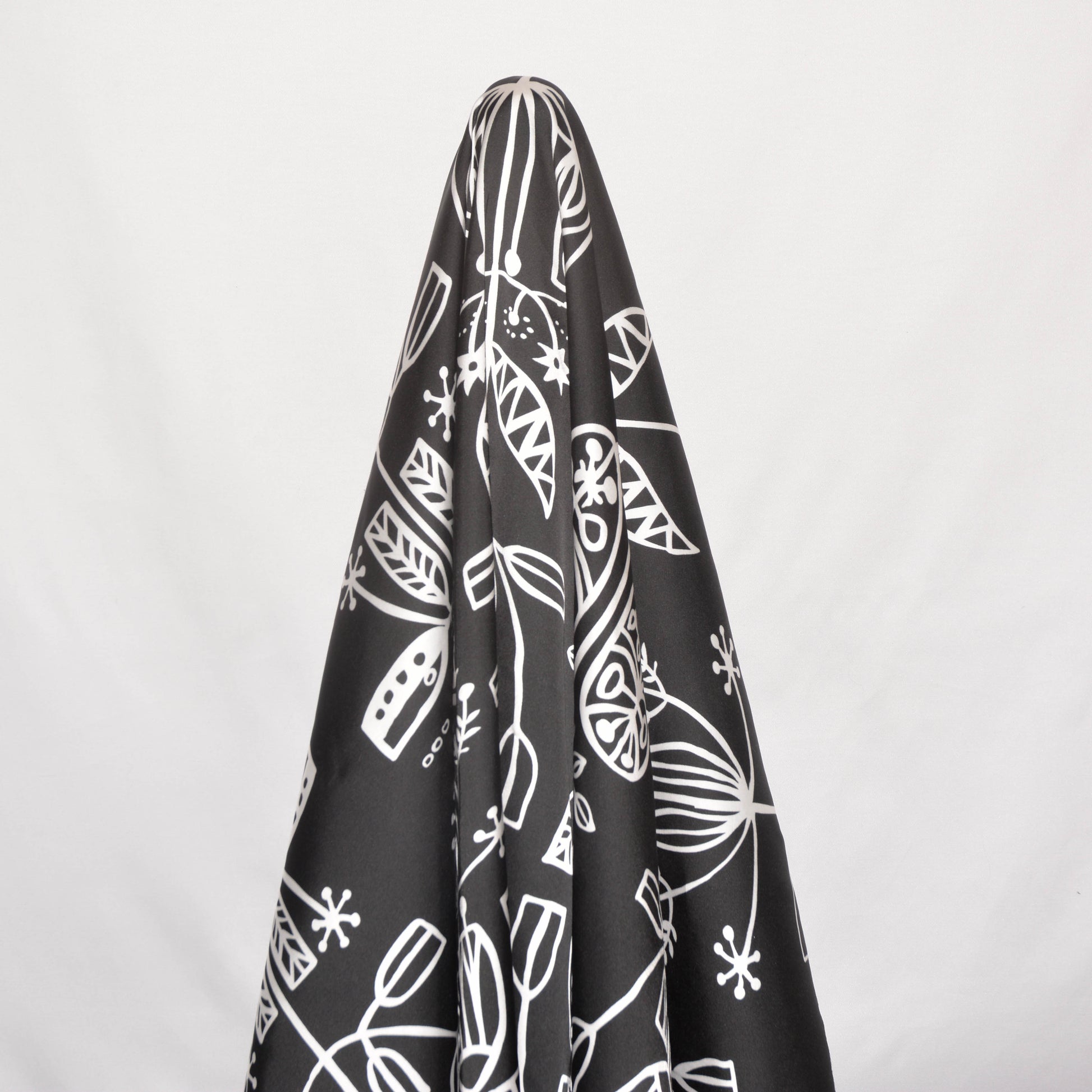 A floaty woven rayon viscose with a satin-like finish. This fabric comes in black and dusty blue, both with a white lino-esque plant pattern.