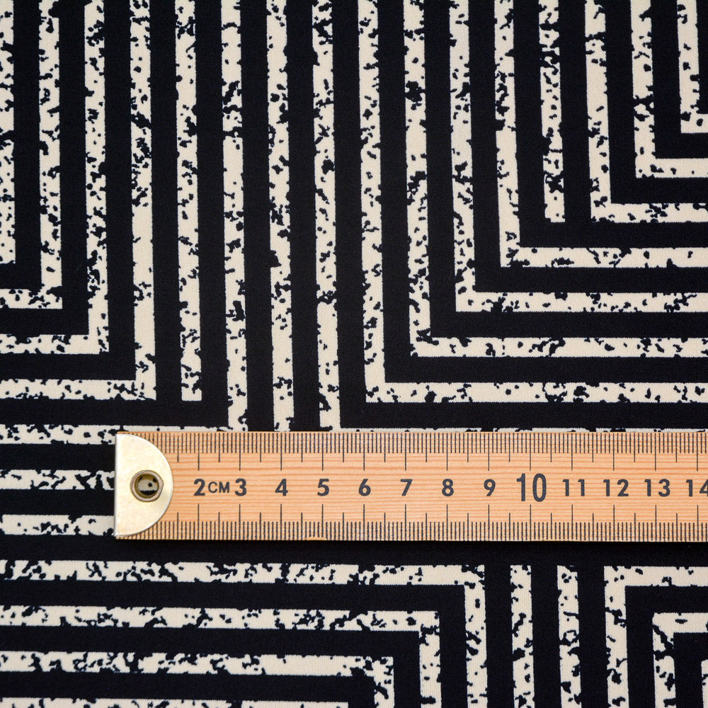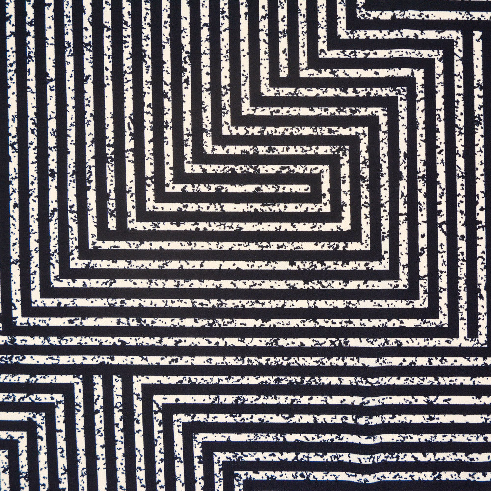 A slinky polyester spandex jersey knit, in a geometric maze pattern in black and cream. Its moderate weight provides a soft bouncy drape, and the four-way stretch is great for creating body-hugging silhouettes. Great for casual wear.