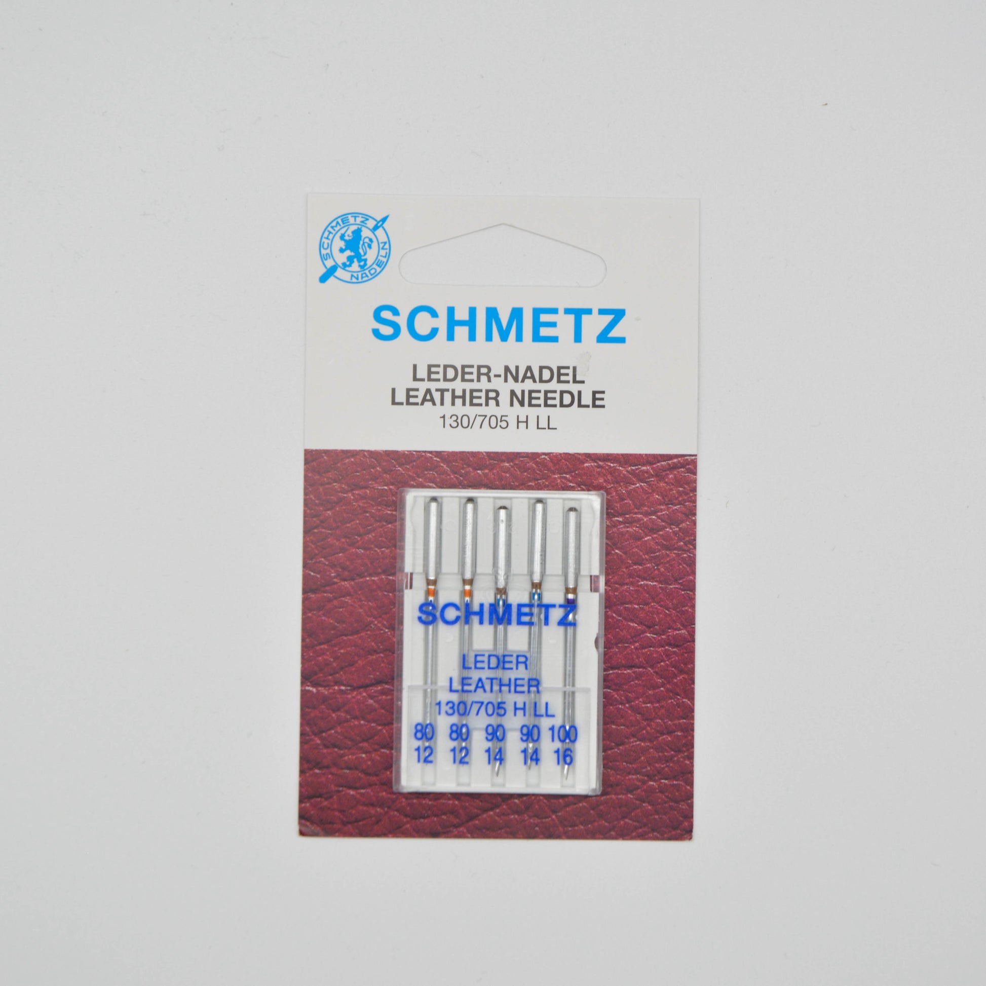 Pack of 5 domestic leather machine needles, ranging from size 90-110.