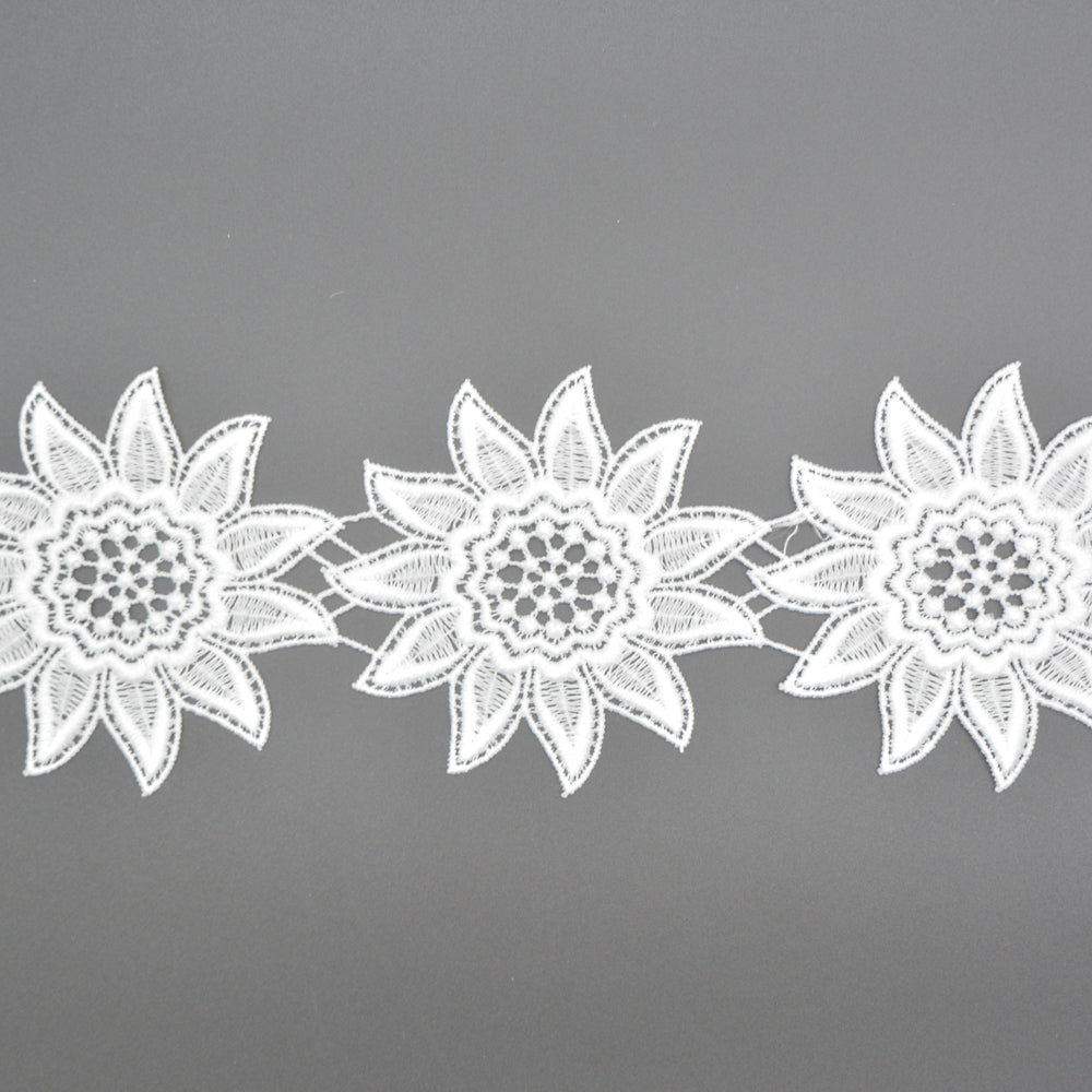 Medium weight lace trim in the shape of a flower with pointed petals, in black and white. This trim can also be separated into individual flowers for appliqué.