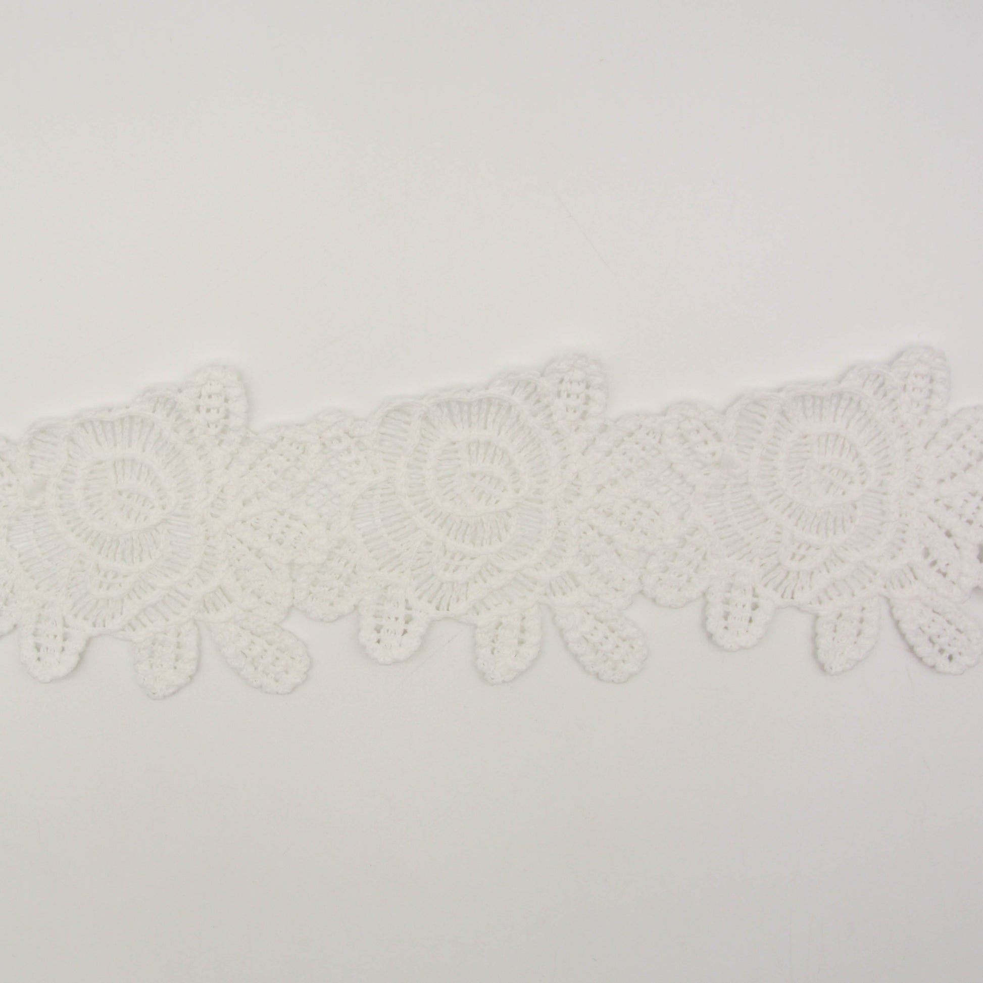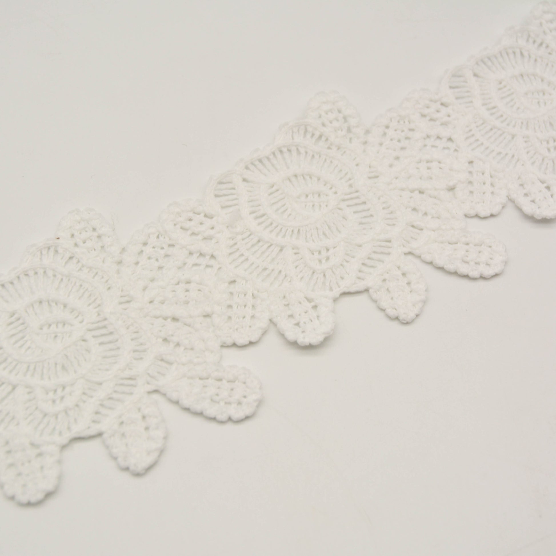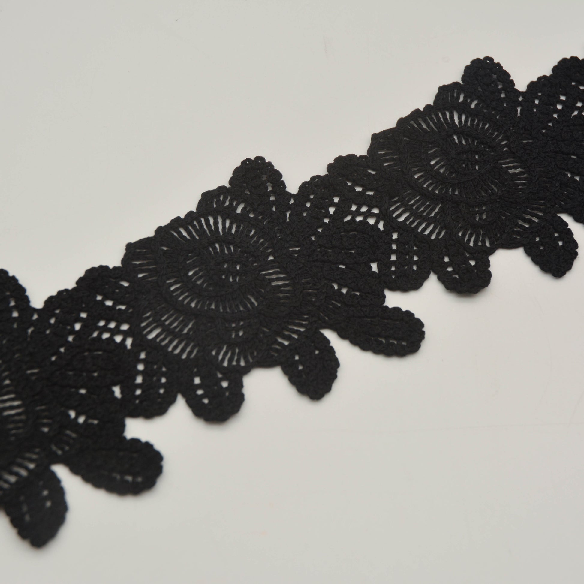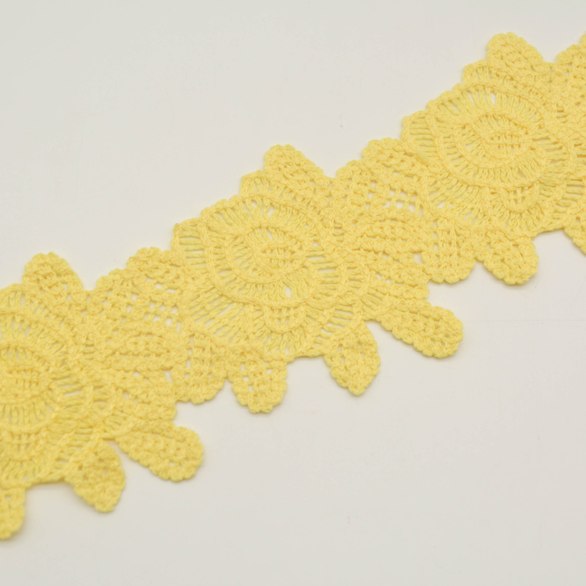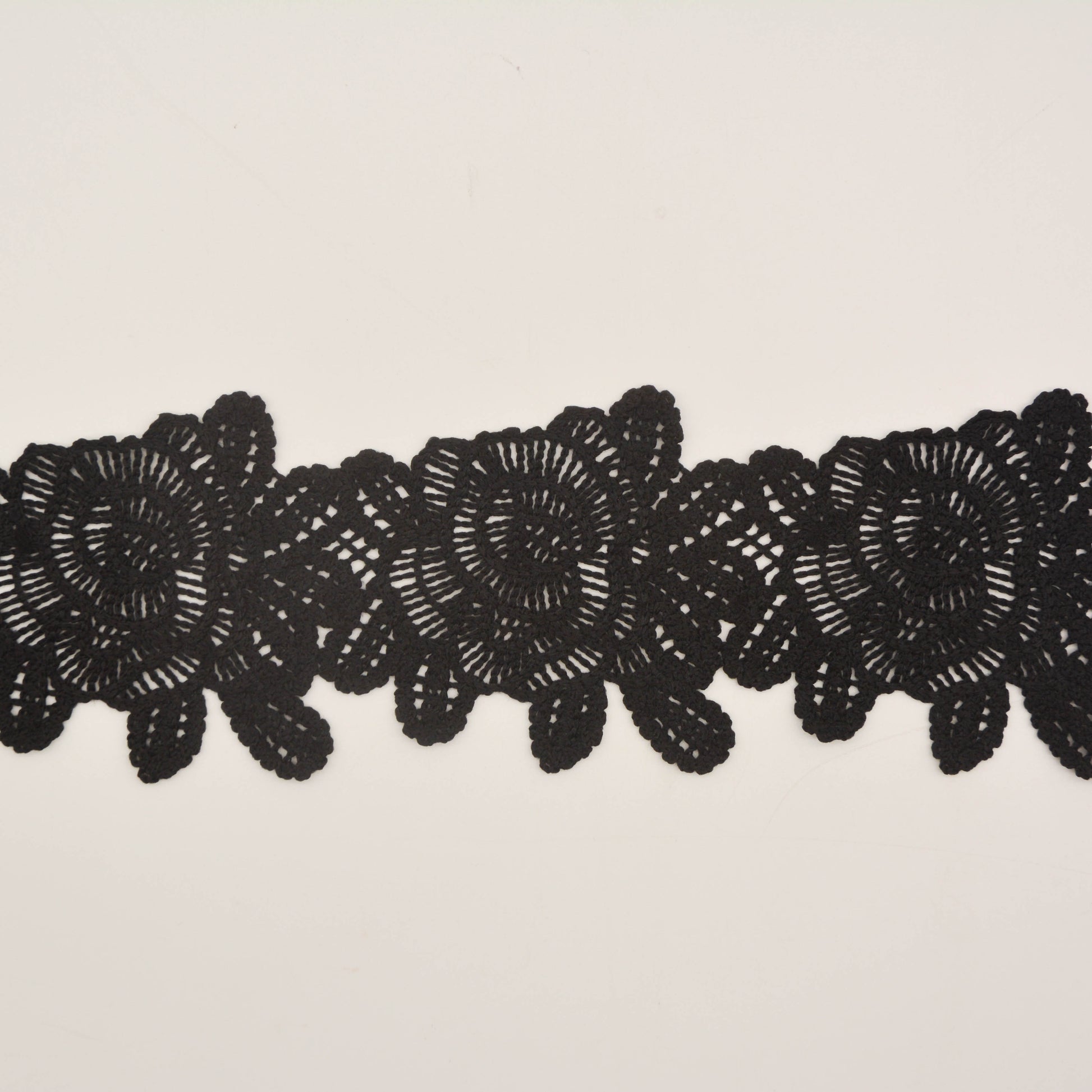 Large rose pattern in a heavy crochet style lace trim, in black, white, yellow or blue.