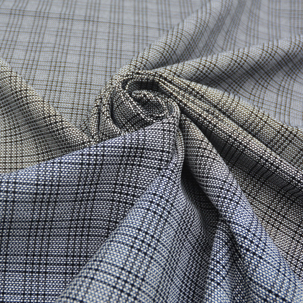 Bouncy rayon blend bengaline with black and white check pattern, softer drape than regular bengaline.