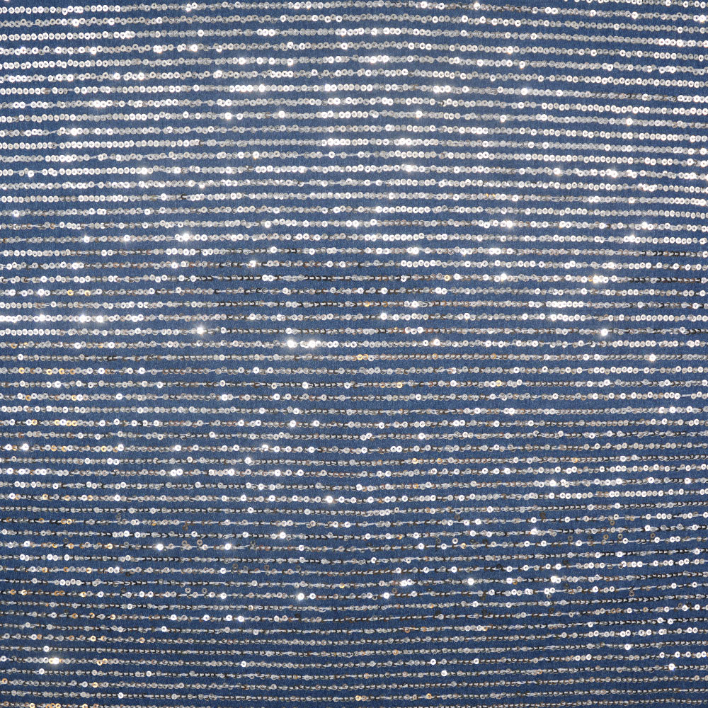 Nice firm denim with glittering silver sequin stripes running from selvedge to selvedge. Stripes approx. 5mm apart. Available in classic blue denim and dark blue denim.
