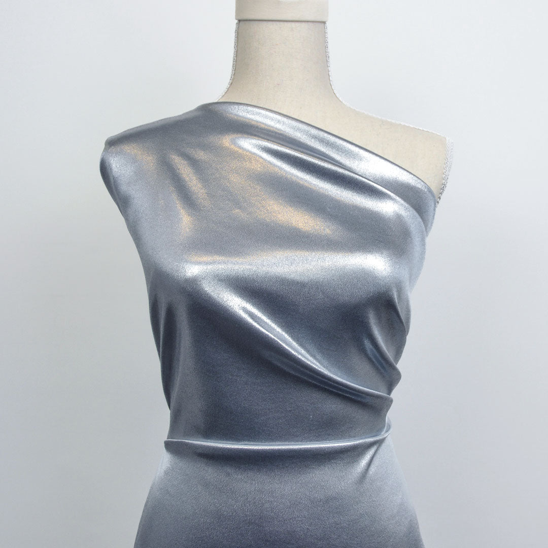 A shiny foil printed polyester. This fabric is perfect to add a gorgeous soft drape and glimmer. It comes in glamourous colours of black, bronze, silver, blush, nude and lime.