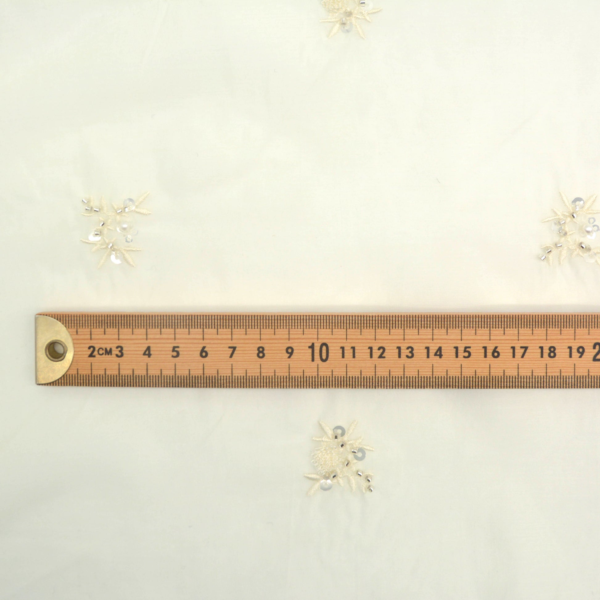 Super light, sheer tencel woven fabric in an ivory cream colour, with small bursts of sequin and bead embroidery. This fabric has a pearlescent luster quality to it under flash.